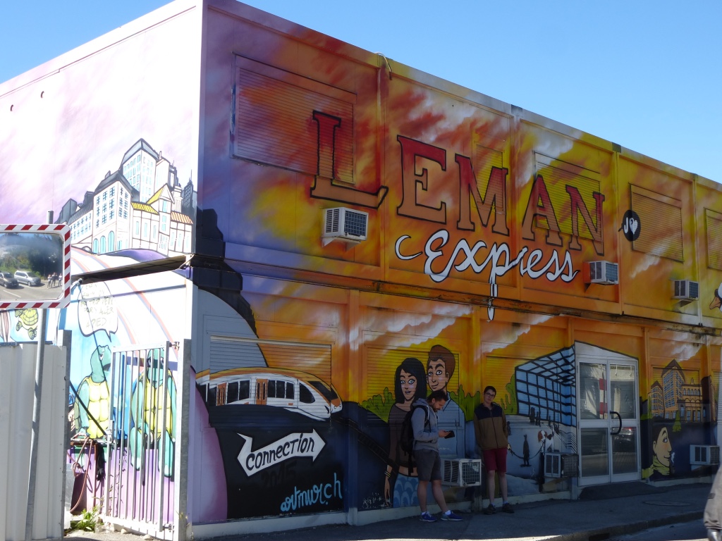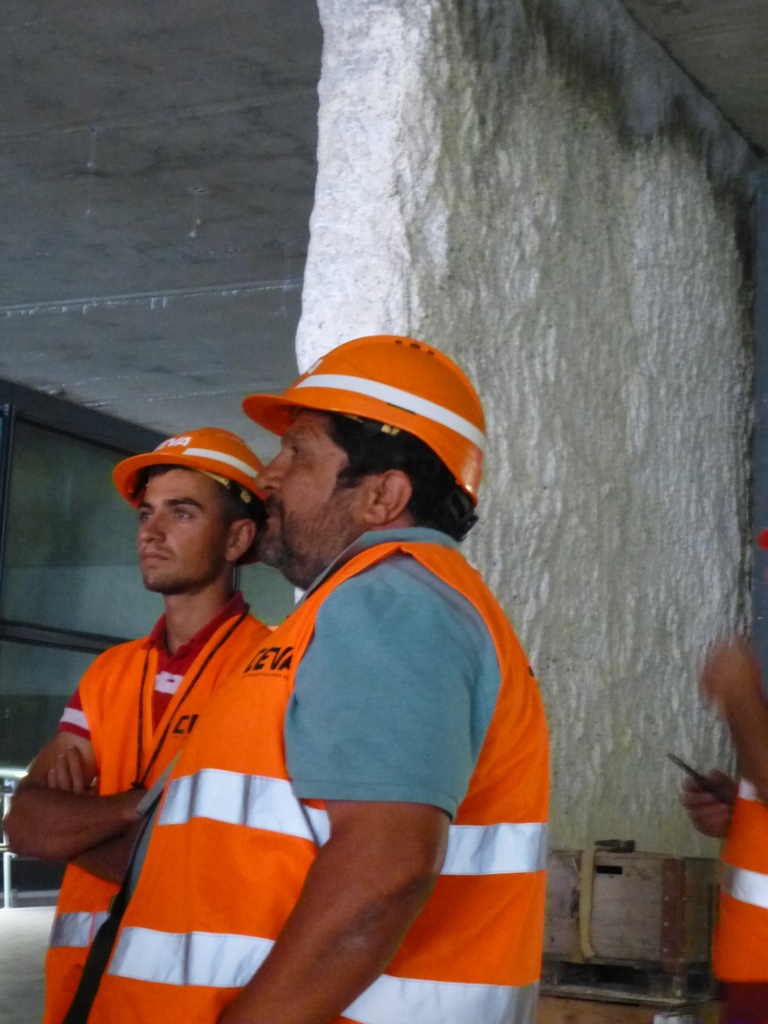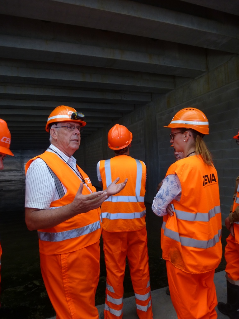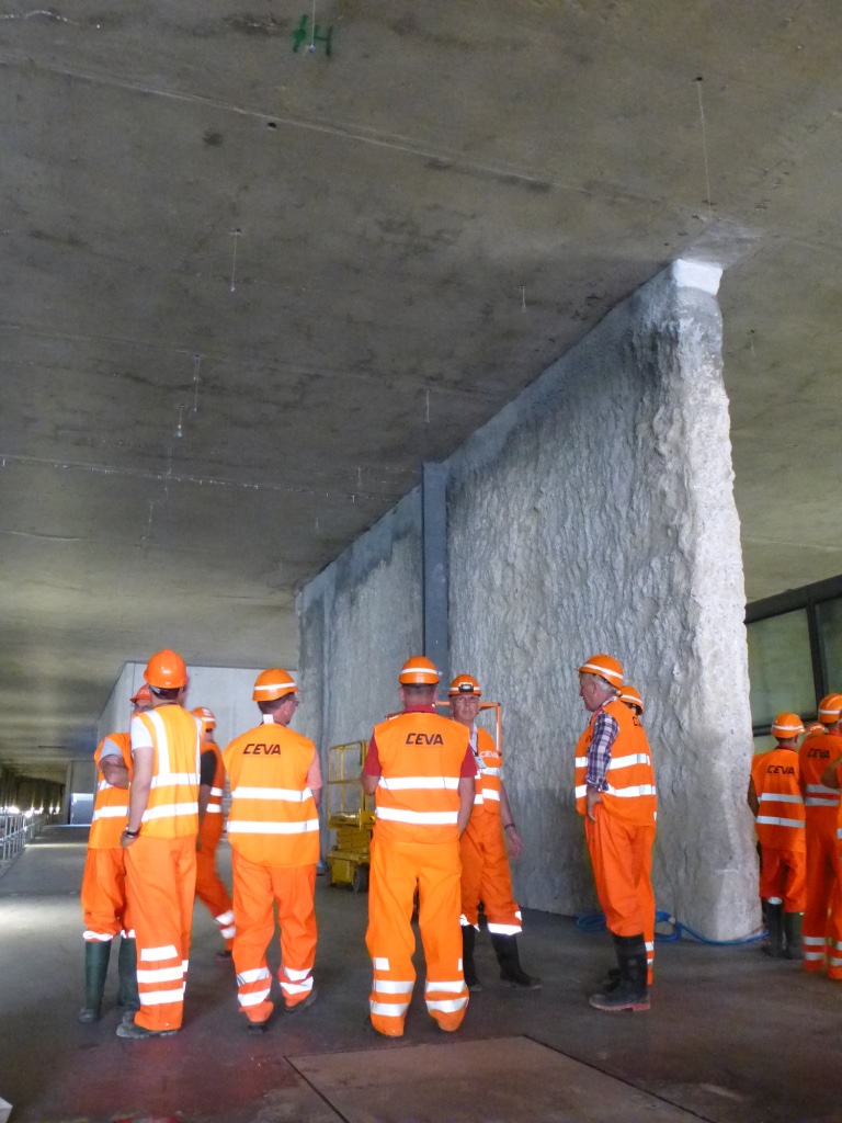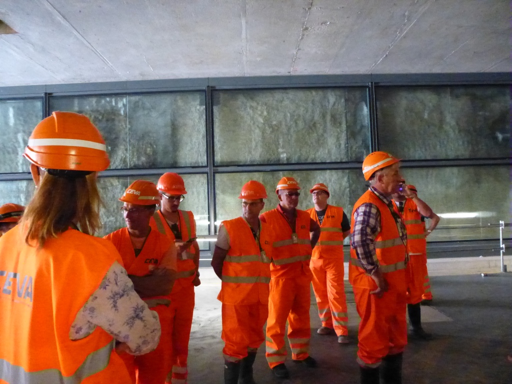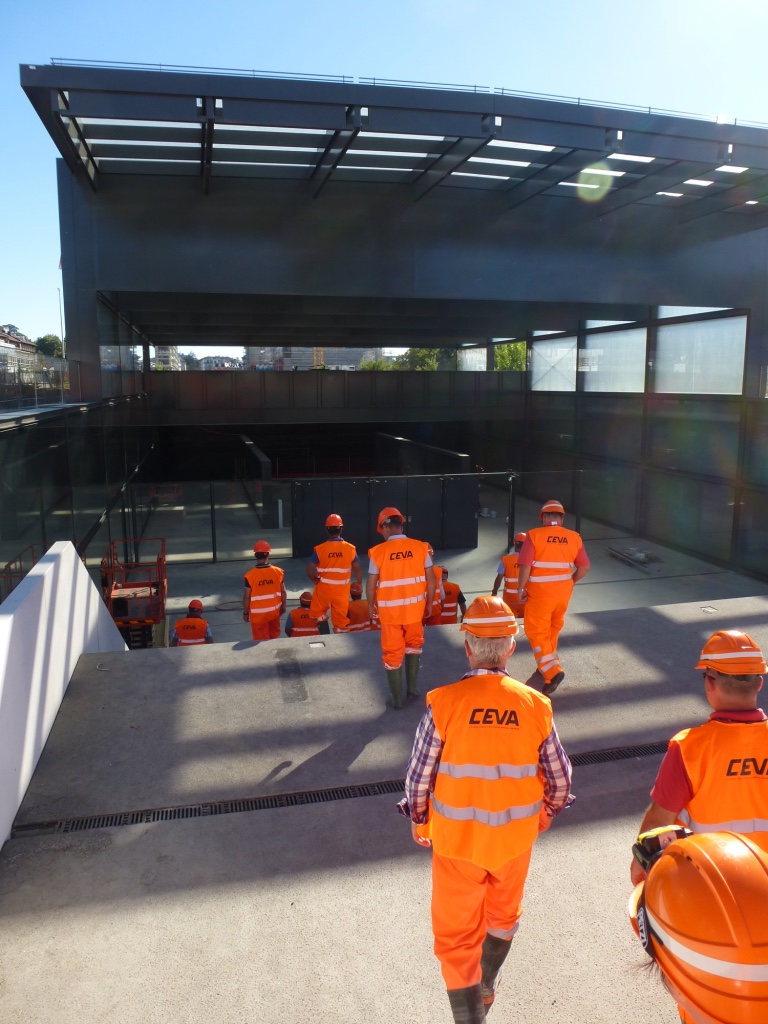 Avant de se rendre sur le chantier, les participants sont donc réunis dans le pavillon coloré du Léman Express/CEVA, où ils peuvent découvrir une petite exposition en attendant les quelques retardataires. Serge Anet, coordinateur des visites et guide du CEVA, présente ensuite le projet avec des explications détaillées, des chiffres, des données techniques et informations sur les différentes procédures et oppositions. Puis tout le monde revêt la tenue de chantier et se dirige vers les travaux de la gare des Eaux-Vives. La « vraie » visite commence pour les invités, tous des professionnels de la construction. La théorie fait place aux questions et entretiens individuels avec les trois accompagnants du CEVA. Les panneaux vitrés recouvrant la gare sont examinés de près : Leur structure confère un caractère spécifique à la gare et diffuse la lumière. Cette caractéristique se retrouve sur tous les chantiers du CEVA.